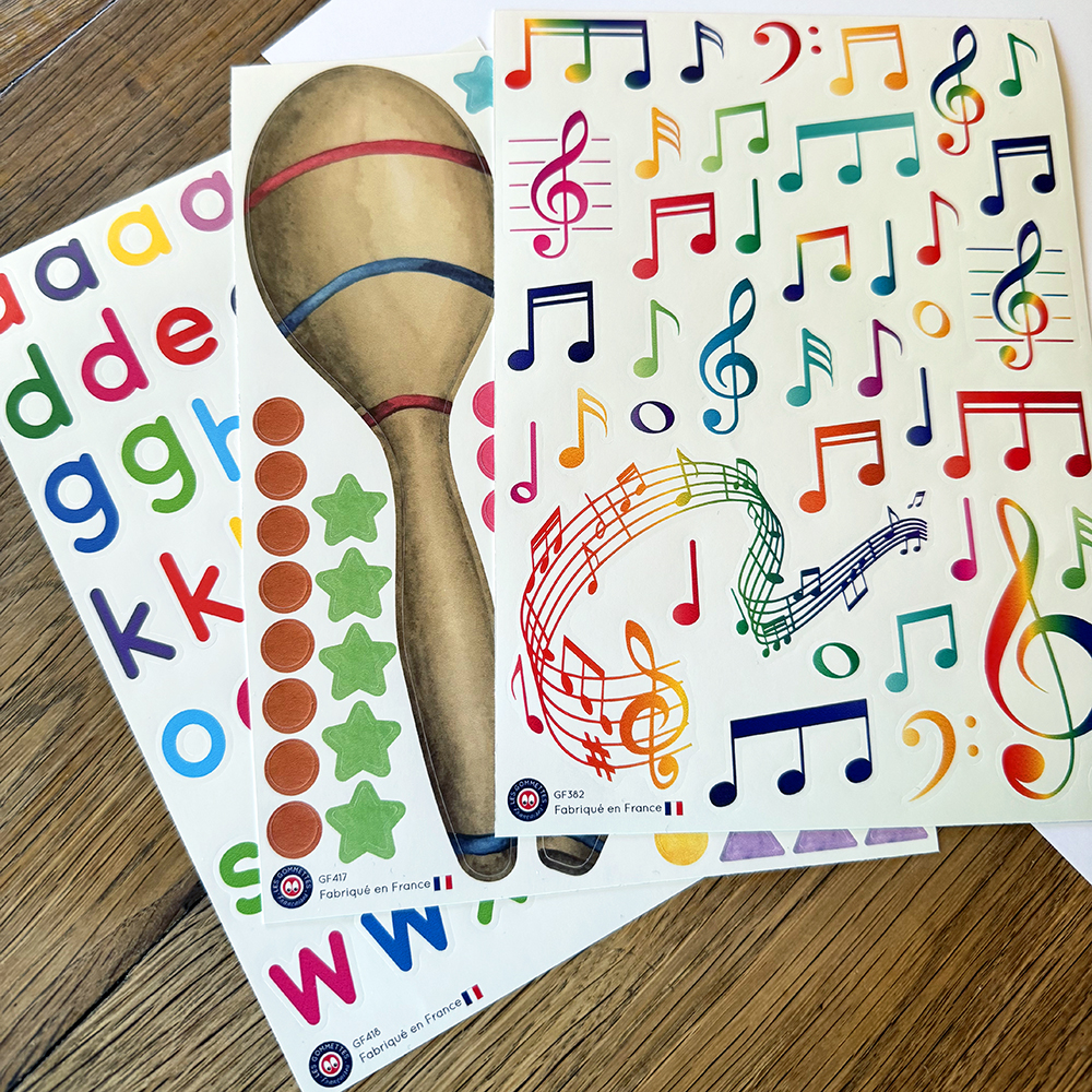 De plus, cette activité trouve naturellement sa place lors de temps forts comme la fête de la musique. Elle reste simple, ludique et accessible. Enfin, les gommettes notes de musique et les gommettes lettres enrichissent l’ensemble et créent un univers complet autour du son et du rythme.
